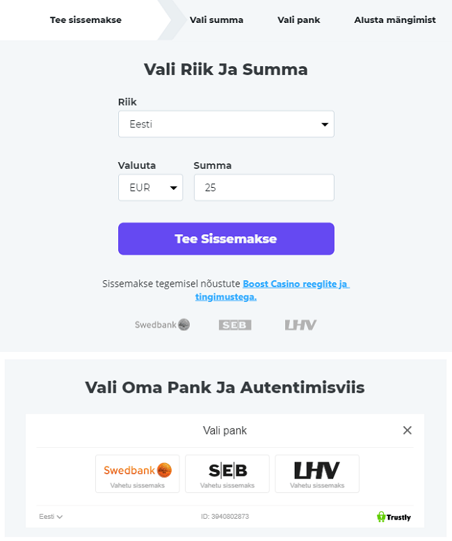 Boost Casino on Pay N Play tüüpi online mängude keskkond, kus mängima saad hakata ilma kontot registreerimata. Vali enda jaoks sobiv maksemeetod Swedbank, SEB ja LHV hulgast ja oledki valmis pärisraha peale panuseid tegema. Minimaalne lubatud sissemakse on 5€ ja maksimaalne ühekordne sissemakse 3000 eurot.