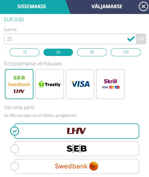 Kuna tegemist on Pay N Play kasiinoga, siis maksete poole eest hoolitseb Trustly. Tee esimene sissemakse ja saad kohe mängima hakata ilma eraldi kontot registreerimata. Valikus on Swedbank, SEB ja LHV. Kui teed konto läbi alternatiivsete võimaluste nagu Smart-ID, mobiili-ID või ID-kaart, on maksemeetodite valik pisut laiem- saad raha kontole kanda ka deebet-või krediitkaardi, Skrill e-rahakoti või MuchBetter makserakendust kasutades.