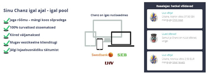 Chanz on läbi aegade Eesti üks populaarsemaid online mängude portaale. Suurepärane veebilehe ülesehitus tekitab tunde nagu oleksid mõnes lõbusas mänguportaalis, kuid Chanzis võid võita pärisraha, mis teeb elamuse veelgi põnevamaks! Kutsu sõpru duellile, osale võidujooksudes või leida endale sobiv Chanz kampaaniate hulgast.